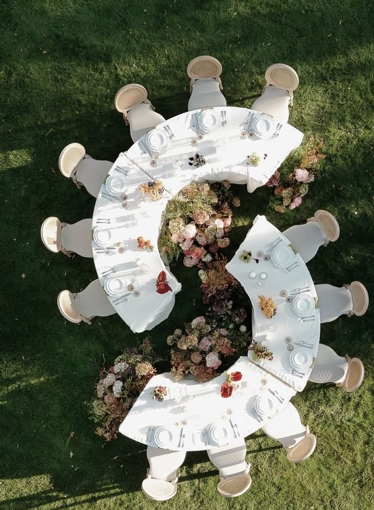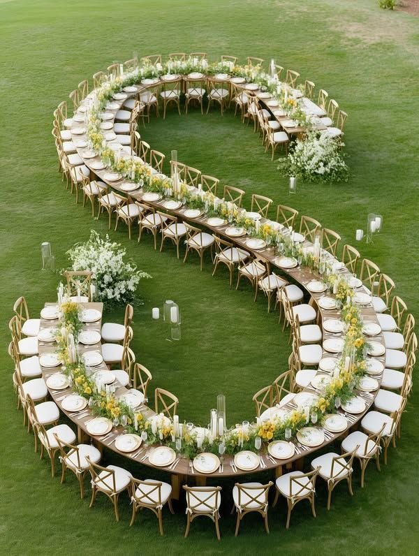 Stůl ve tvaru vlny pro zhruba 6 osob - záleží na velikosti židlí, které ke stolům použijete. Tyto stoly lze sestavit do různých tvarů. Každá hostina tak bude s touto tabulí jedinečná, neotřelá, nápaditá.