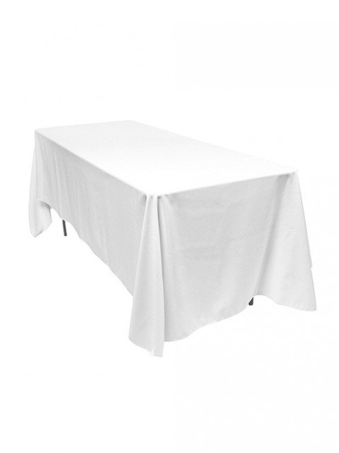 Klasický bílý obdélníkový svatební ubrus o velikosti 230 x 300 cm. Při použití na našich obdélníkových stolech ubrusy sahají až po zem. Na každém stolu do šířky 80 cm budou ubrusy sahat po bocích až k podlaze. Nemusíte řešit zakrývání nevzhledným nohou stolů.